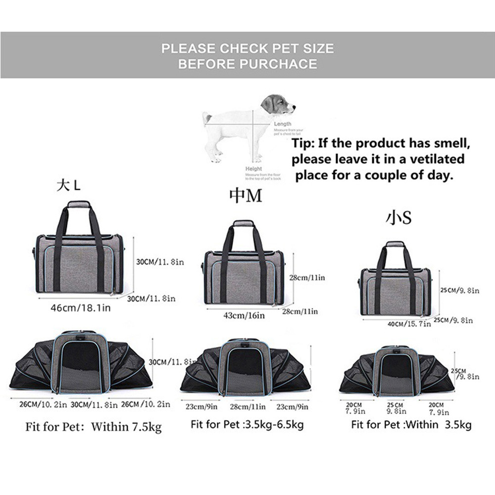 M: 43*28*28cm, for pets weighing 3.5-6.5kg (bag stretch 23+28+23cm)